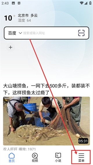 1、在浏览器首页点击底部的【菜单】按钮,就能展开功能选项面板,找到隐私相关的操作入口啦。