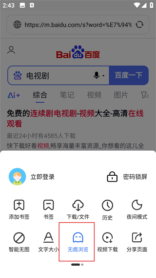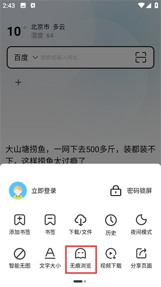 2、展开功能面板后找到【无痕浏览】选项,点击它就能开启无痕模式,保护浏览隐私啦。
