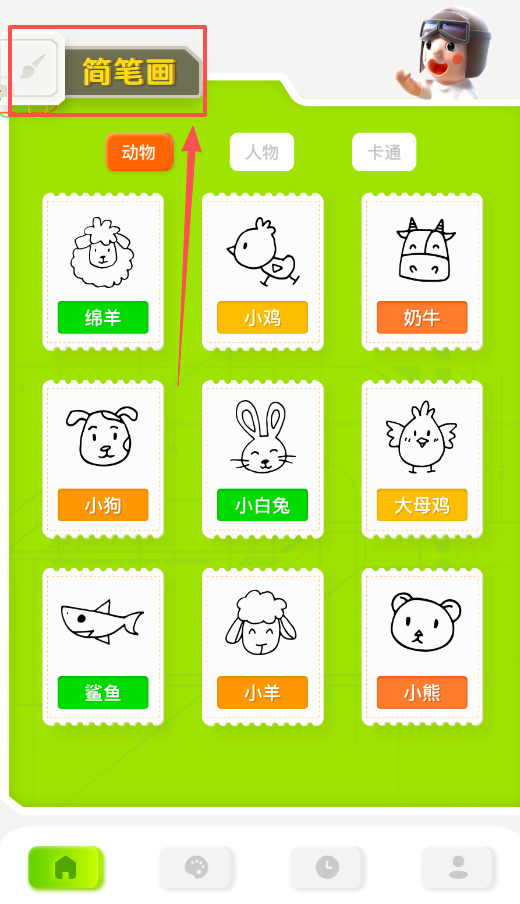 1、打开软件后,建议新手先试试“简笔画”功能,选择你喜欢的点击进入,就能跟着轮廓练习画画,操作简单容易上手。