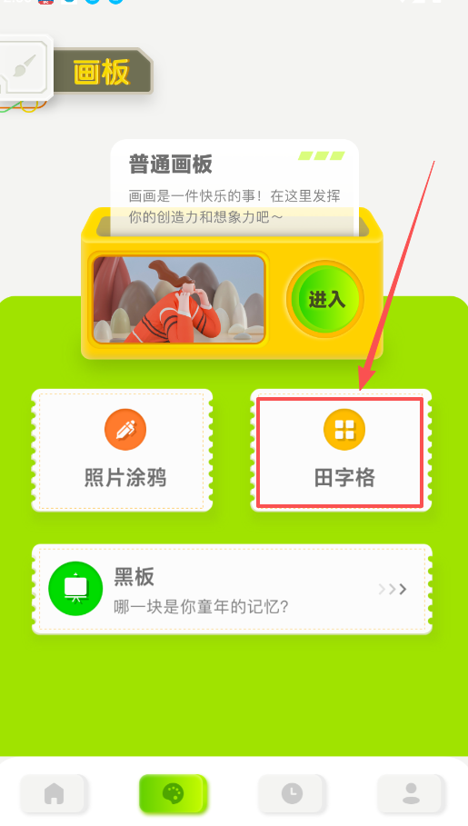 3、在画板区域还能看到“田字格”和“黑板”两种模式,点击“田字格”,你可以在这里随意书写或画些小画。