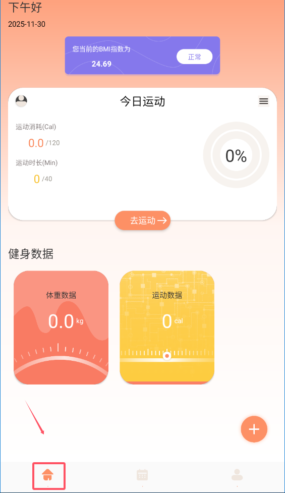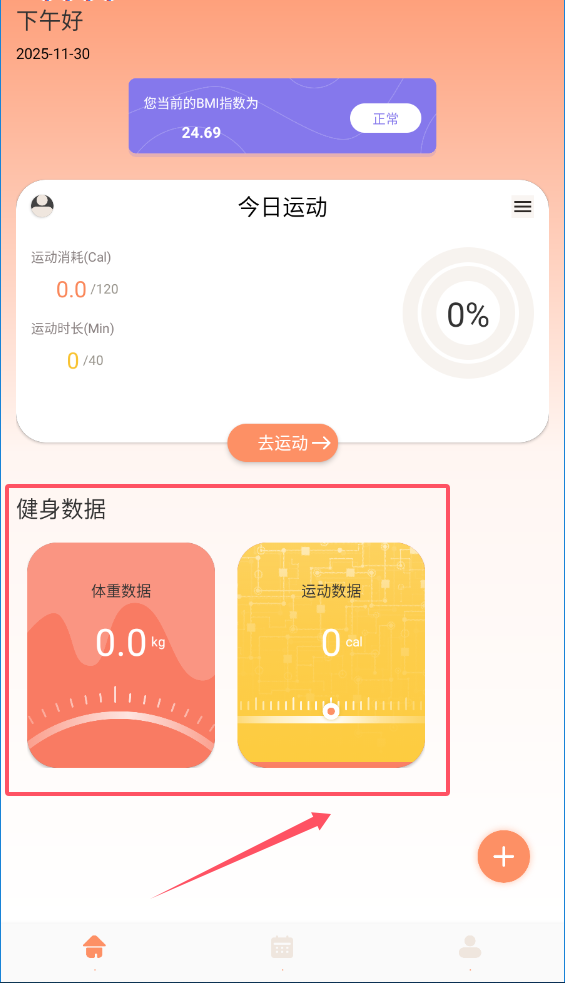 3、使用日历功能记录每日训练,点击右下角橙色加号添加锻炼内容,系统会自动统计月度运动量,重要节日会有特别健身提示很贴心。