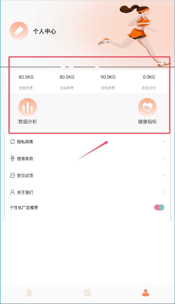 1、打开应用后先进入个人中心完善基本信息,点击铅笔图标可以设置身高年龄等基础数据,系统会根据这些信息生成个性化健身方案。