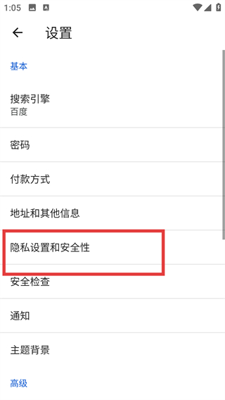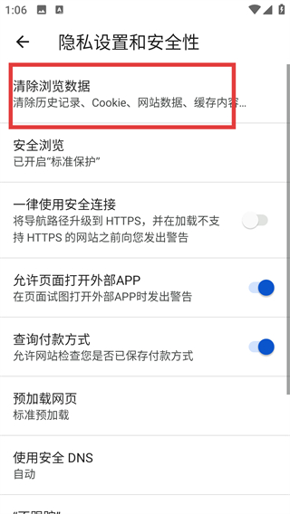 3、在隐私设置和安全性页面选择【清除浏览数据】选项,就能进入数据清理的具体设置界面啦。