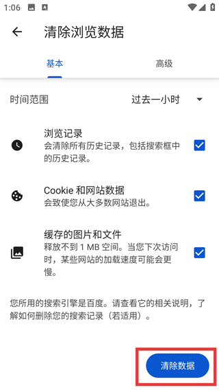 4、在清除浏览数据界面确认勾选项后,点击【清除数据】按钮,就能完成指定范围的浏览数据清理啦。
