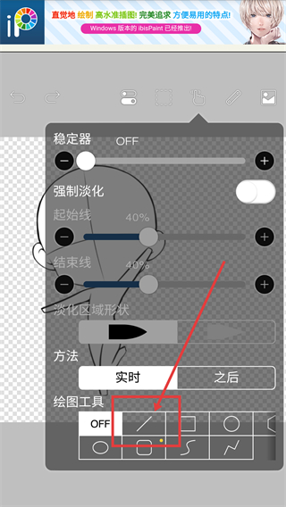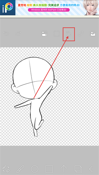1、在ibisPaint绘画界面,点击顶部的手势工具按钮,就能打开辅助绘制的功能面板啦。