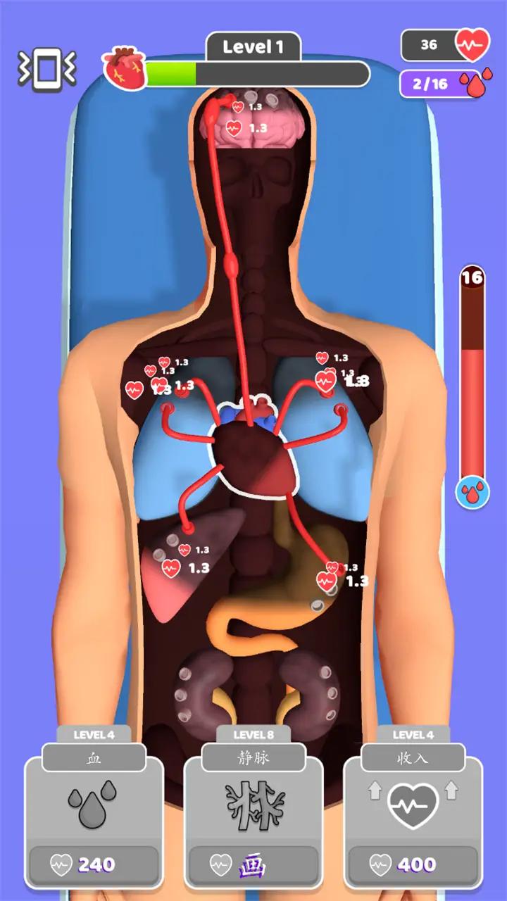 《复活大师》这款游戏里面为我们的玩家带来的独特的趣味,在这里我们将会尝试救人的操作,为了为人体的各个器官进行供血,我们必须要提升供氧的效率,而这一切都要靠我们的心脏了,不断地提升心脏的供血效率,相信这样的玩法相信大家会喜欢的,你也快来试试吧。