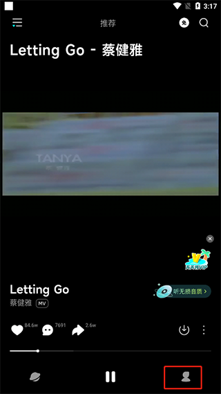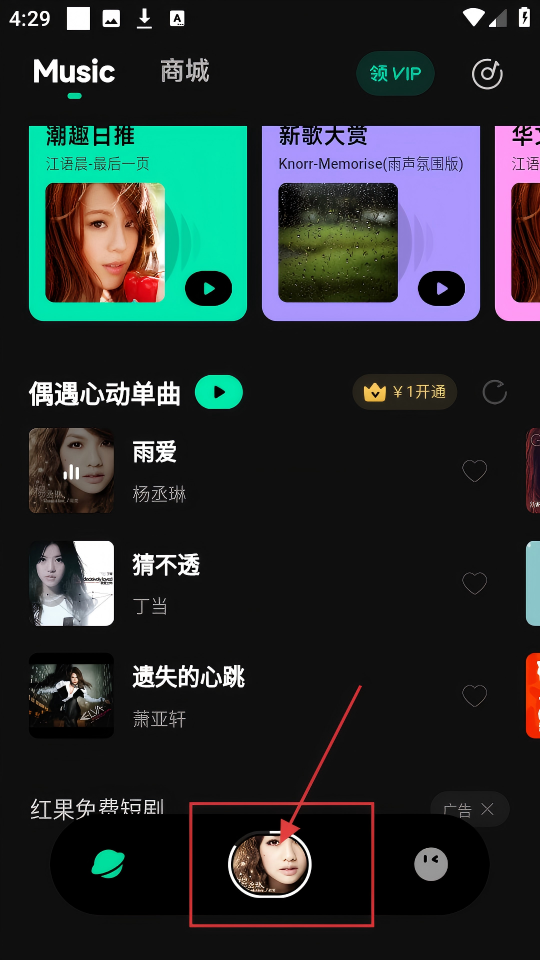 1、在音乐主页面,看到底部播放栏里的歌曲,点击它就能进入播放页面,快去操作吧。