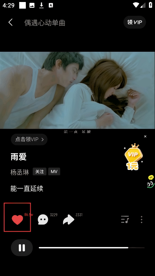 3、点击心形图标后,图标变成红色,说明收藏成功,这样就能轻松找到喜欢的歌曲啦。