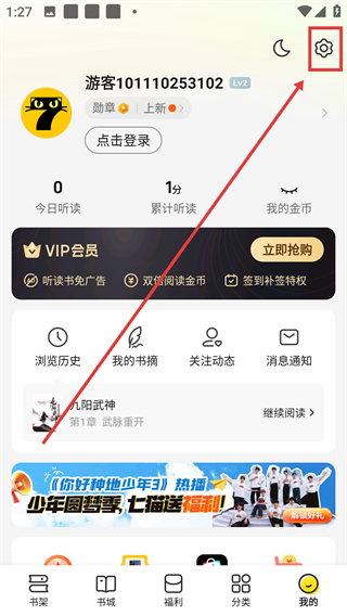 1、在【我的】界面点击右上角设置图标,进入设置页面,准备调整阅读相关配置哦。