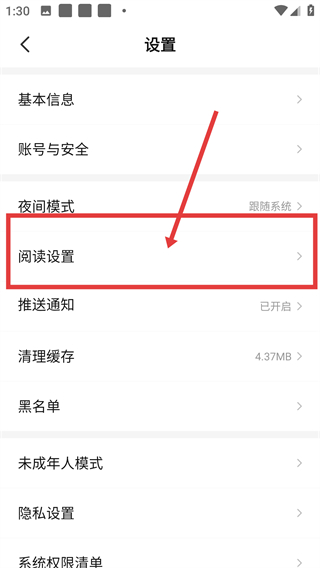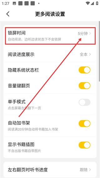 2、在设置页面点击【阅读设置】,进入更多阅读设置界面,可调整锁屏时间等选项啦。