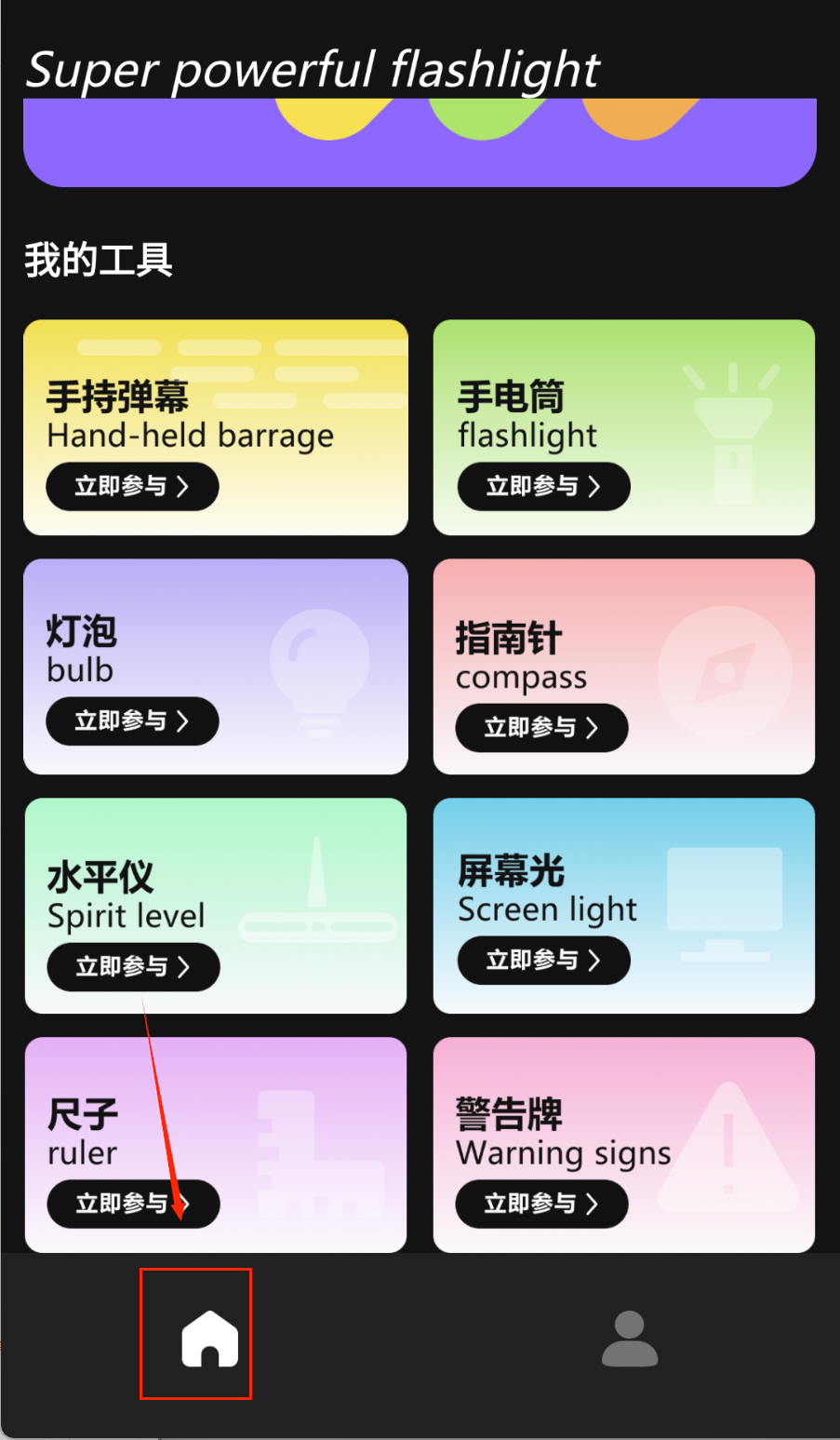 2、软件的核心工具都在主页的“我的工具”板块下。你会看到手持弹幕、手电筒、灯泡、指南针等选项,色彩分明。
