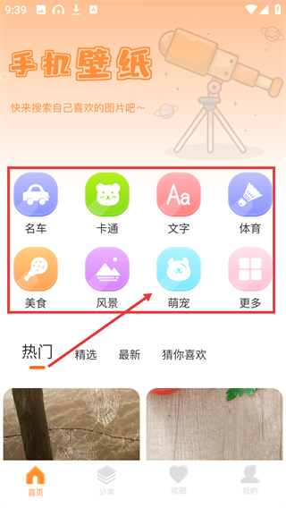 1、在手机壁纸首页选分类标签,比如【萌宠】,点它就能进入对应分类的壁纸列表界面啦。
