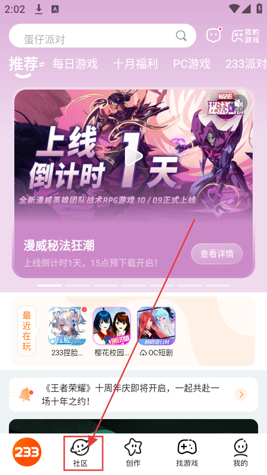 1、首先打开233乐园,然后在右上角的部位可以看见一个下载的箭头,点击进入;