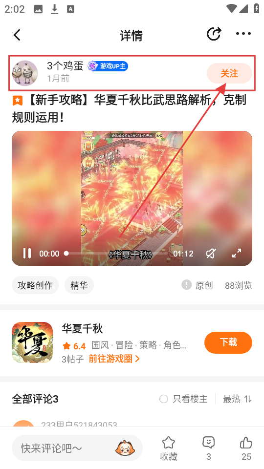 3、遇到优质攻略作者,比如发【华夏千秋】攻略的,点【关注】,这样就能及时看到他新出的攻略啦。