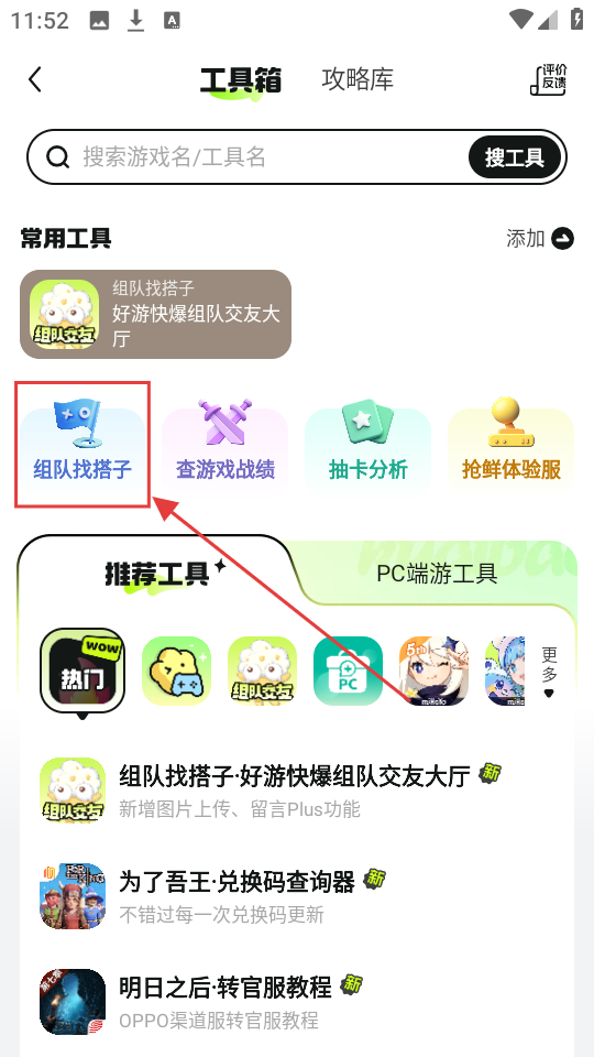 2、进入工具箱后,找到【组队找搭子】工具,点击它就能进入组队交友相关页面,寻找游戏伙伴咯。