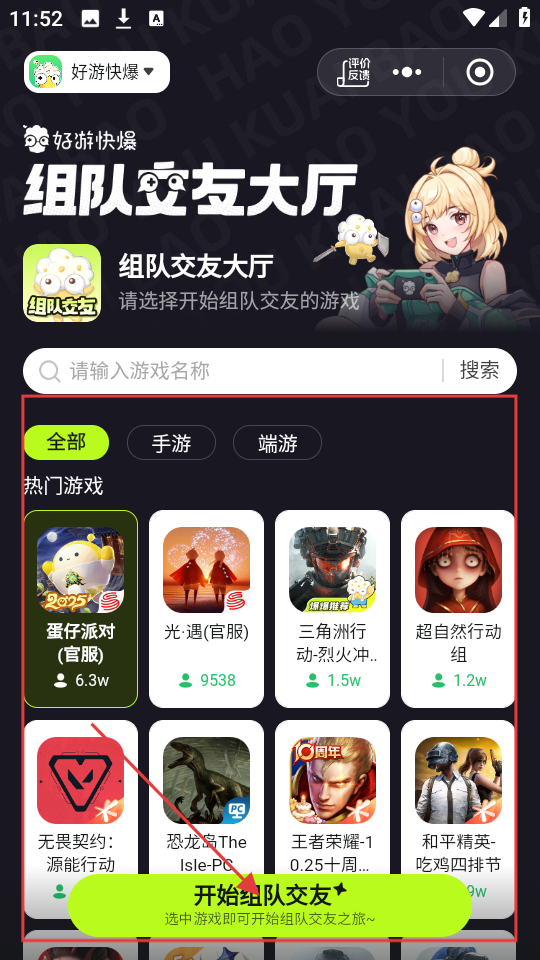 3、进入组队交友大厅,有热门游戏列表,选好心仪的游戏,点击【开始组队交友】,就能开启组队之旅啦。