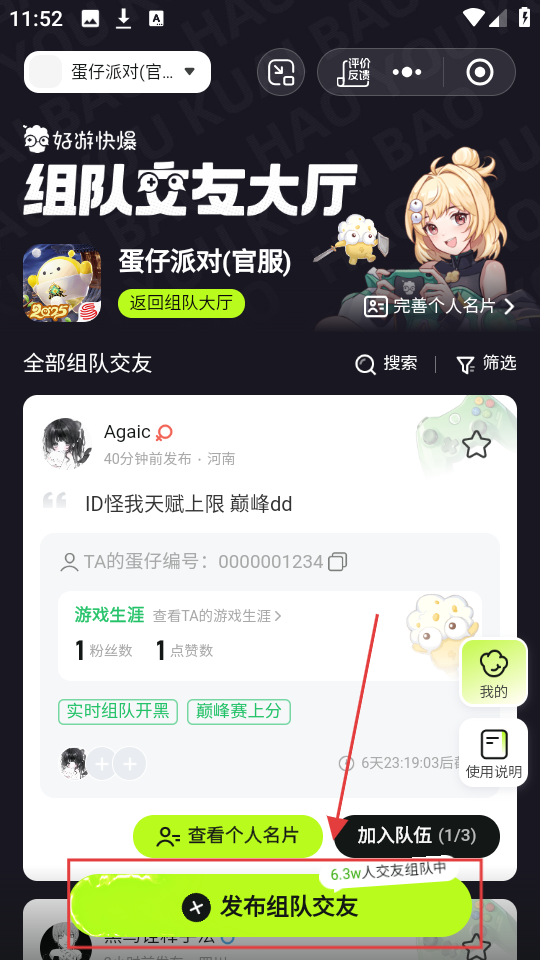 4、比如选《蛋仔派对》后,进入对应组队页面,点击【发布组队交友】,就能发布组队信息,找小伙伴一起玩啦。