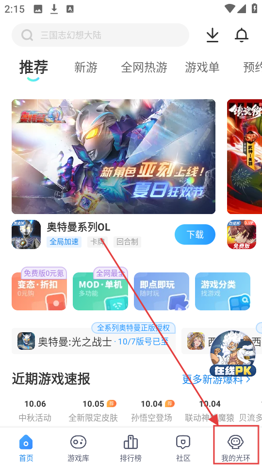 1、下载安装光环助手,打开进入首页,如下图,点击我的;