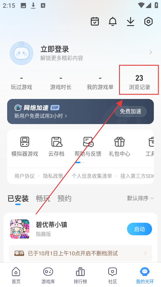 2、在个人中心,我们点击【浏览记录】,就能查看之前浏览过的游戏等内容,回顾感兴趣的信息。