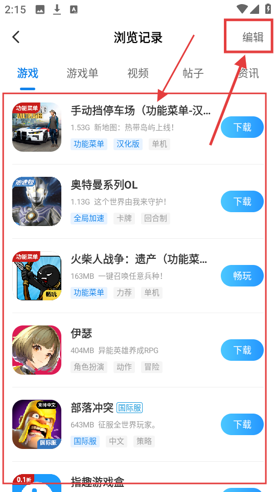 3、进入浏览记录页面后,能看到之前浏览的游戏列表,点击右上角【编辑】,可对浏览记录进行管理。