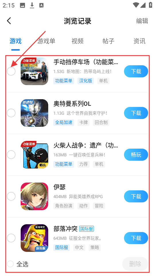 4、点击编辑后,每个游戏条目前会出现选择框,我们可勾选想要操作的浏览记录,进行删除等操作啦。