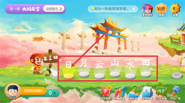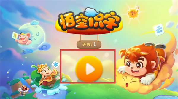 1、在游戏启动页点中间的播放按钮,就能进入【悟空识字】的关卡界面,开始当天的识字任务啦。