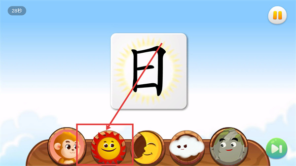 3、在汉字互动页选对应的形象,比如【日】对应的太阳图标,点它就能完成该汉字的初步匹配啦。