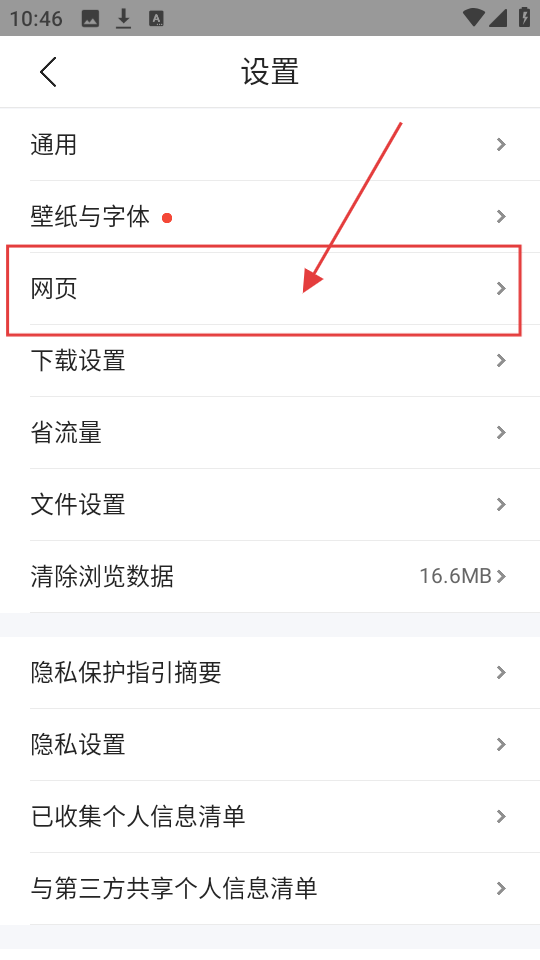 2、进入设置页面后,我们点击【网页】,就能进入网页设置页面,准备调整网页相关设置。