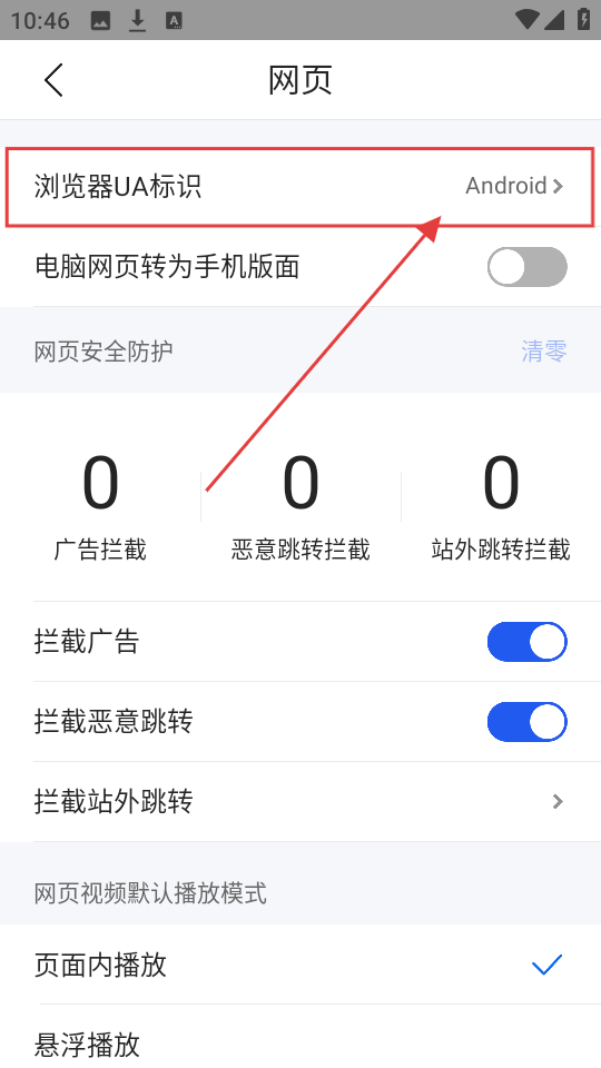 3、进入网页设置页面后,我们点击【浏览器UA标识】,就能进入浏览器UA标识设置页面。