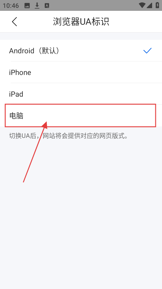 4、进入浏览器UA标识设置页面后,我们点击【电脑】选项,这样网站就会提供电脑版的网页版式啦。