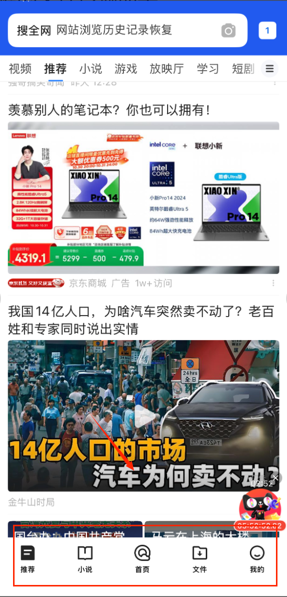 3、浏览内容时可以灵活使用底部导航栏,“推荐”页有热门资讯,“小说”版块提供精选书单,“首页”集中核心功能。