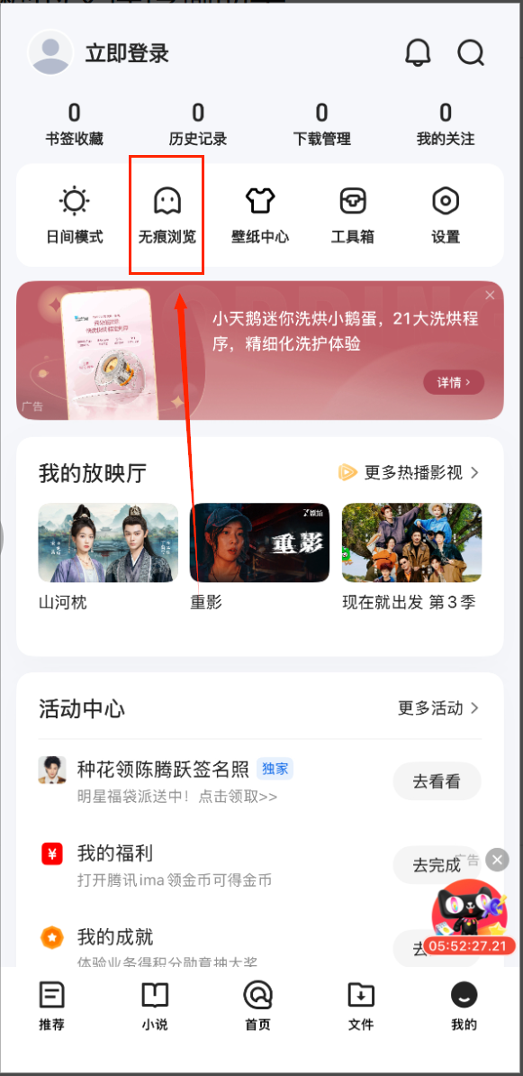 4、软件还集成了实用小工具,在工具箱能找到无痕浏览、壁纸中心等功能,活动中心经常有签到领金币等福利任务。
