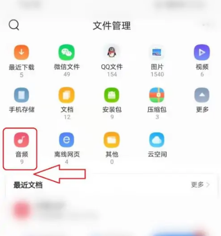 8、返回QQ浏览器文件管理页面,点击【音频】。