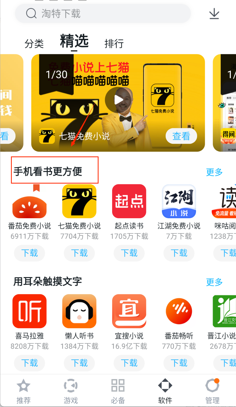 3、对于有明确类别偏好的用户,比如爱看书或听书,可以注意页面上“手机看书更方便”、“用耳朵触摸文字”这类专题推荐板块。