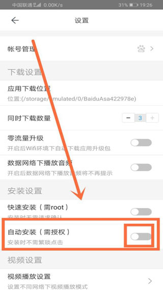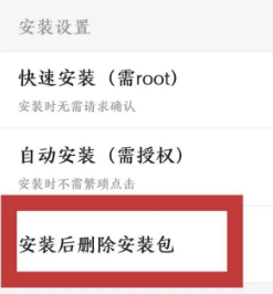4、在百度手机助手设置页面中,找到“安装后删除安装包”一栏。