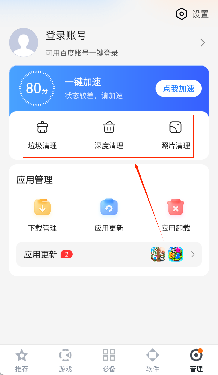 1、第一步是定期优化手机性能,进入软件首页后先完成一键加速,这个操作能快速关闭无用后台程序,解决卡顿问题,让手机流畅起来。