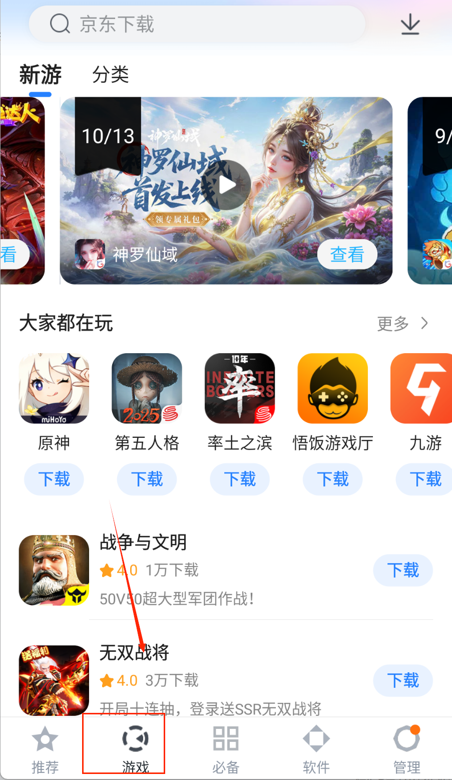 3、寻找游戏的话,可以点击底部导航栏的“游戏”标签,在这里能看到“新游”推荐和“大家都在玩”的热门游戏列表,浏览游戏图标和介绍。