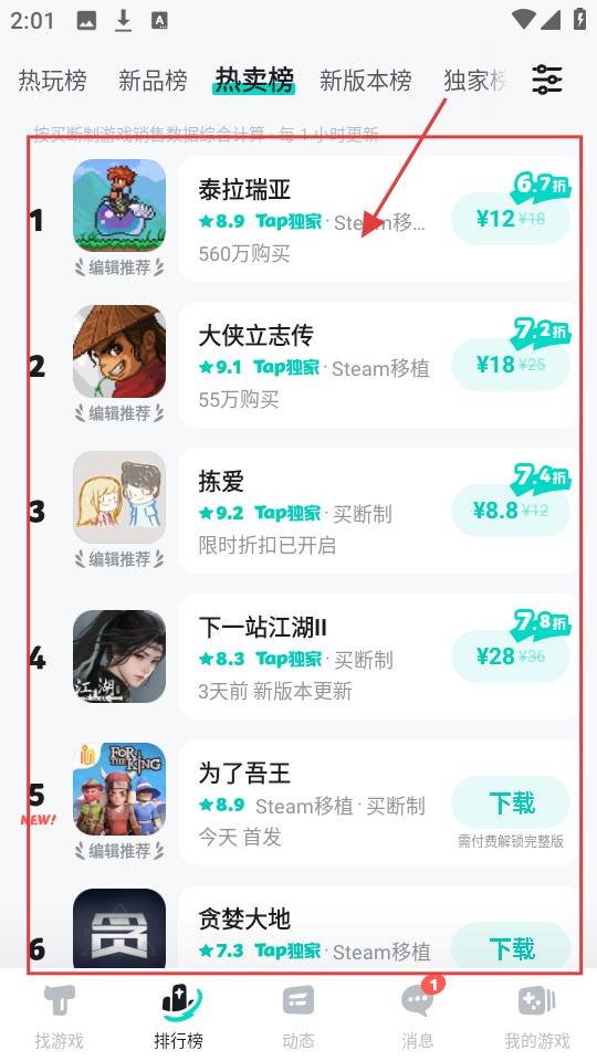 1、在热卖榜里,能看到像【泰拉瑞亚】【大侠立志传】等热门游戏,选中心仪游戏,就能进入其详情页面啦。