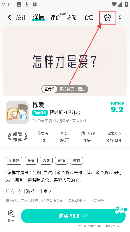 2、进入游戏详情页面,点击右上角星形收藏图标,就能把游戏加入收藏,方便后续查找咯。