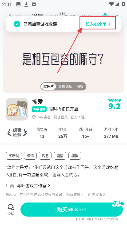 3、收藏游戏后,还能点击【加入心愿单】,把游戏添加到心愿单,不错过游戏相关动态啦。