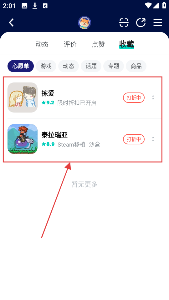 4、进入收藏页面,切换到心愿单标签,就能看到已加入心愿单的游戏,像【拣爱】【泰拉瑞亚】等都在其中啦。