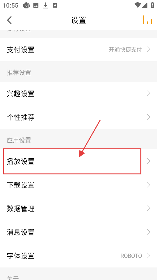 3、在设置页面,有支付设置、播放设置等选项,点击【播放设置】,就能进入播放设置页面呢。