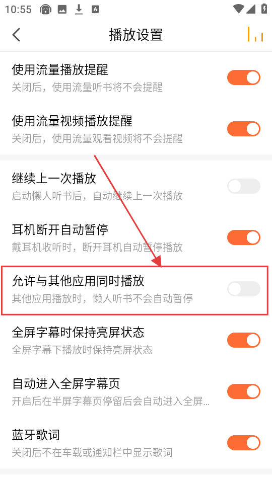 4、到了播放设置页面,能看到“允许与其他应用同时播放”等选项,根据需求开启或关闭相应功能就可以啦。