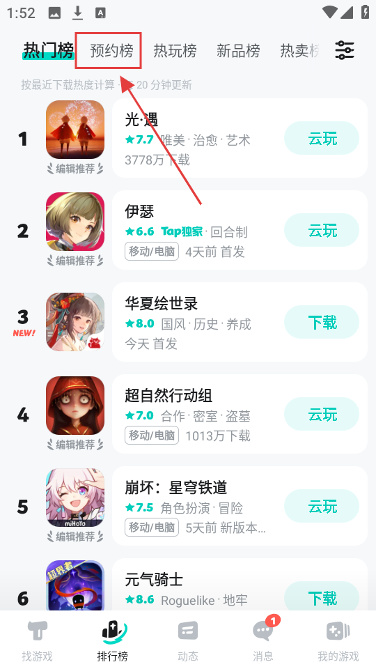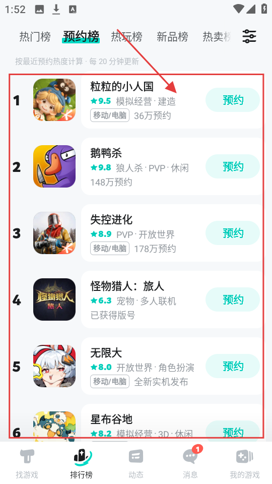 2、进入排行榜页面,点击【预约榜】,就能看到按预约热度排序的游戏列表,方便找到热门预约游戏咯。