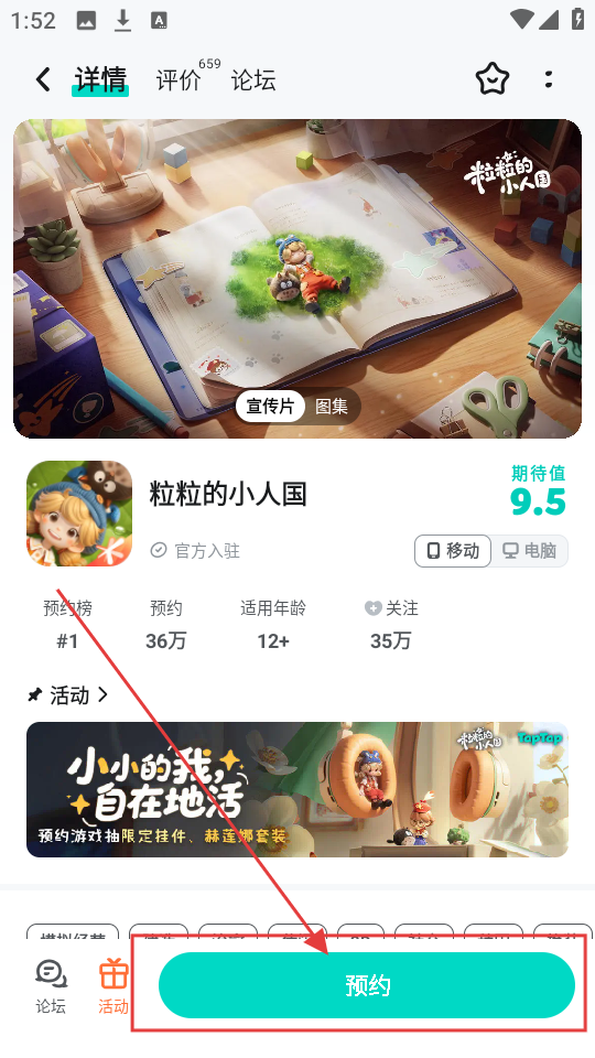 4、进入游戏详情页面,看到底部【预约】按钮,点击它就能完成该游戏的预约,不错过游戏上线啦。