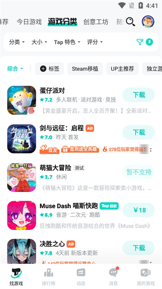 2、想要发现新游戏可以点击底部导航栏的"找游戏"选项,这里会有热门推荐和分类筛选功能,你可以根据类型、评分等条件找到心仪的游戏。