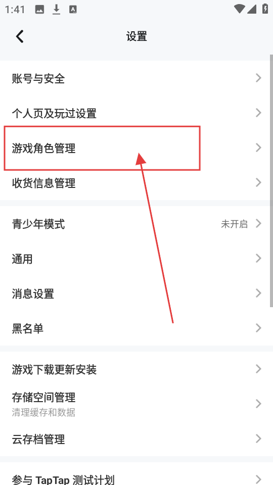 2、进入设置页面,找到【游戏角色管理】选项,点击它就能进入我的游戏数据页面,管理游戏角色咯。