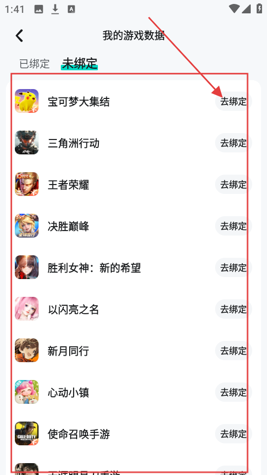 3、进入我的游戏数据页面,能看到未绑定的游戏列表,像【宝可梦大集结】等,点击游戏旁【去绑定】就能进行绑定啦。