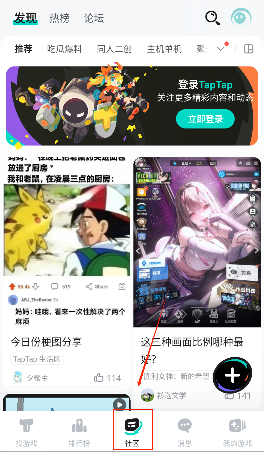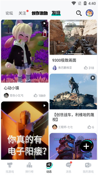 4、社区功能可以让你和其他玩家交流,在发现页面能看到各种游戏资讯和玩家分享,遇到有趣的内容可以点赞评论。