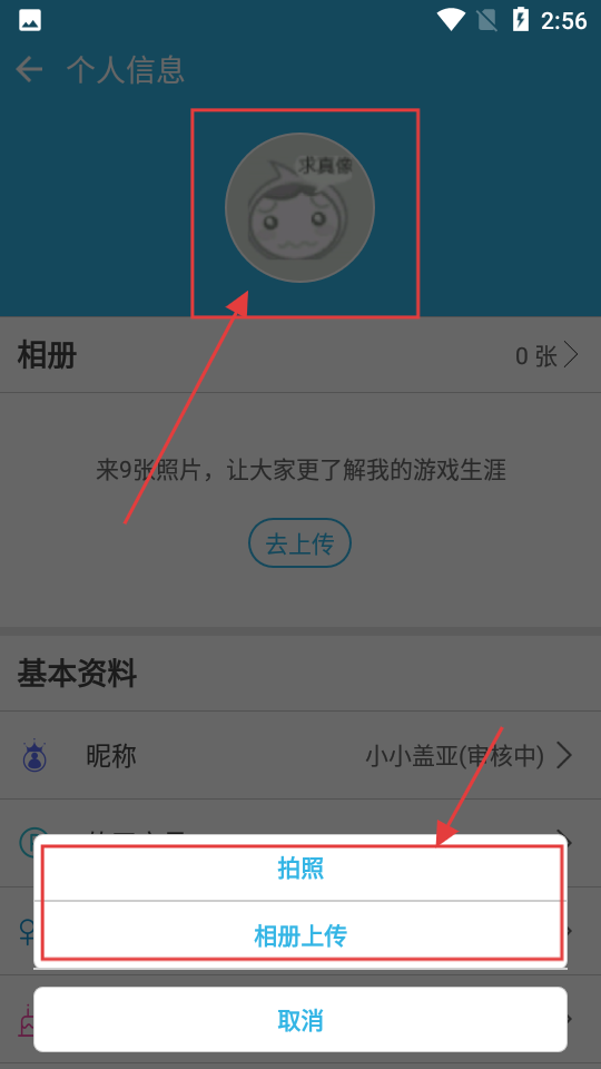 4、点击个人头像,可选择拍照或从相册上传新头像,更换个性化头像啦。